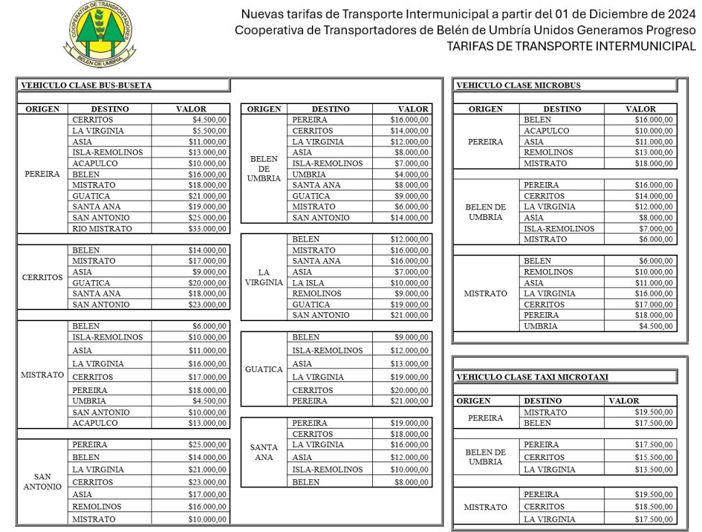 ¡Importante! Para las rutas que tienen origen en una ciudad diferente a Belén de Umbría, la disponibilidad de cupos al pasar por Belén depende de la ocupación del vehículo desde su salida. Agradecemos su comprensión y le recomendamos planificar su viaje con anticipación.